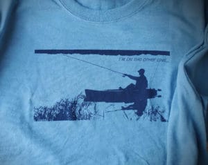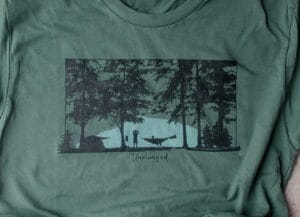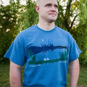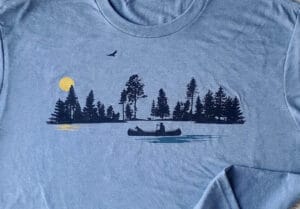 I hand screen print ‘Canoeing with my pal‘ on a super soft 4.5-ounce, 50/25/25 poly/combed ring spun cotton/rayon tee.