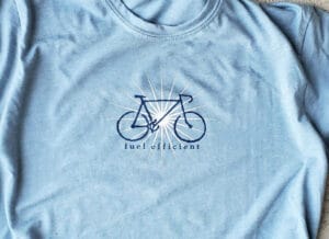 I designed & printed ‘fuel efficient‘ several years ago when we attended an art festival with a bike race as one of the events attractions. Never thought it would still be with us after the race was over. I was wrong. Still a strong favorite !