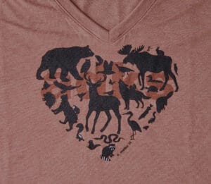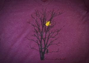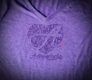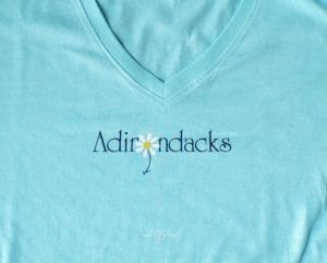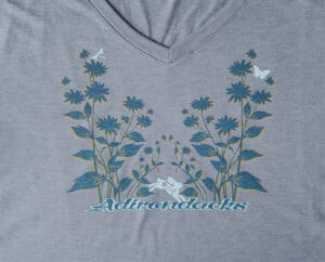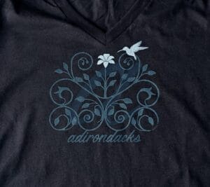 Inspiration for ‘Hummingbird‘ comes from several sources: our love for the Adirondack region (the ‘a’ in the background), hummingbirds (how awesome are they? Right?!) & a friends photo of a decorative iron gate feature (supporting the flower.) The shirt: a crazy soft ladies short sleeve v neck: 50/25/25 poly/combed ring spun cotton/rayon. You are gonna love how this shirt feels!