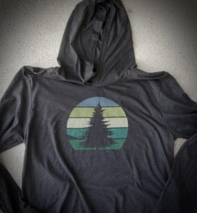 This lightweight super soft hooded long sleeve was the perfect shirt for me to print my ‘Circle Pine‘ on. I custom mixed 5 inks to go nicely with the Black Frost color of the poly/combed ring spun cotton/rayon 4.5 ounce fabric.