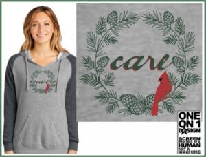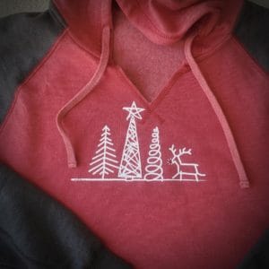 I hand screen print Maroon ink on this Red Frost lightweight hooded long sleeve – I promise you’ll love how soft this shirt is!