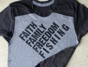 ‘FAITH FAMILY FREEDOM FISHING‘ are some of the most important things in life! This 2 toned tee (Heather Gray body & Charcoal Gray sleeves, shoulders, neck & back) is a super soft mix of 60% cotton & 40% polyester. You are gonna love how this shirt feels!