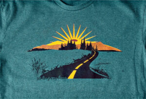 ‘Running Pines‘ is one of those designs I KNEW was going to challenge me in both choosing the right shirt color & ink colors – they all needed to play well together & that is not an easy task! Each ink I custom mixed – achieving the color harmony & contrast I was hoping for – took hours. Finally though, success. *Whew!