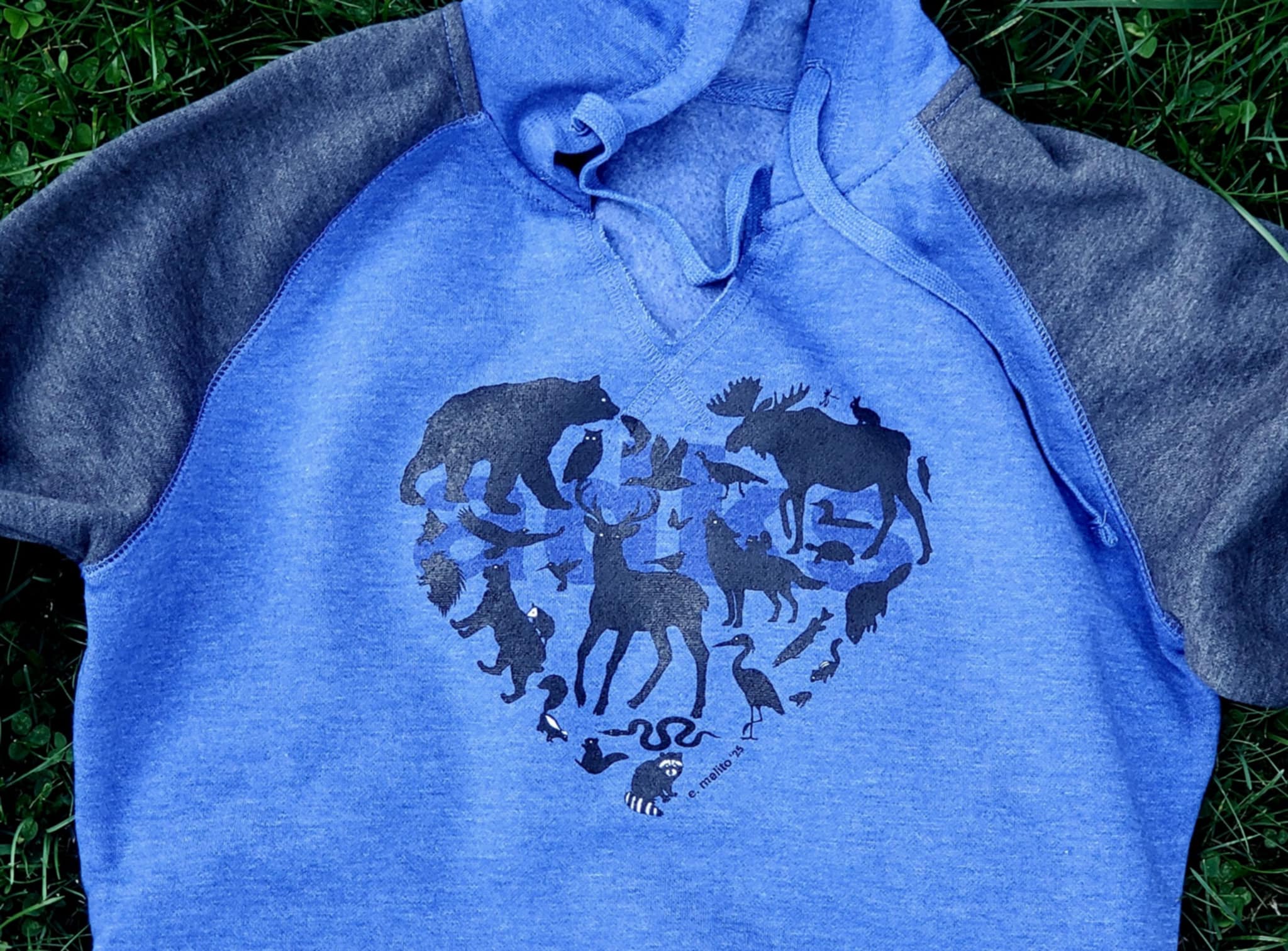 I hand screen print my snowy ‘Plaid‘ Adirondack mountain on a lightweight soft hooded long sleeve.